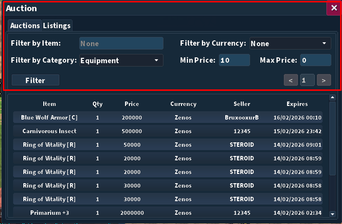 - Filtro por Moeda: Você pode escolher transacionar em Aust Crystals (cash do jogo) ou Zenos (moeda padrão).