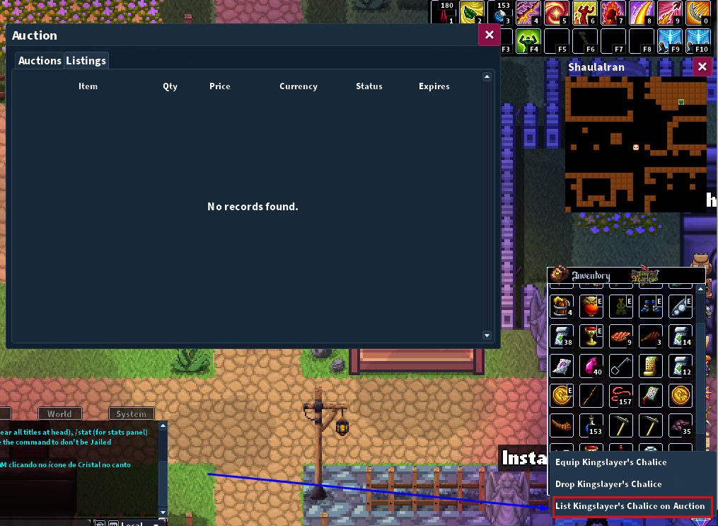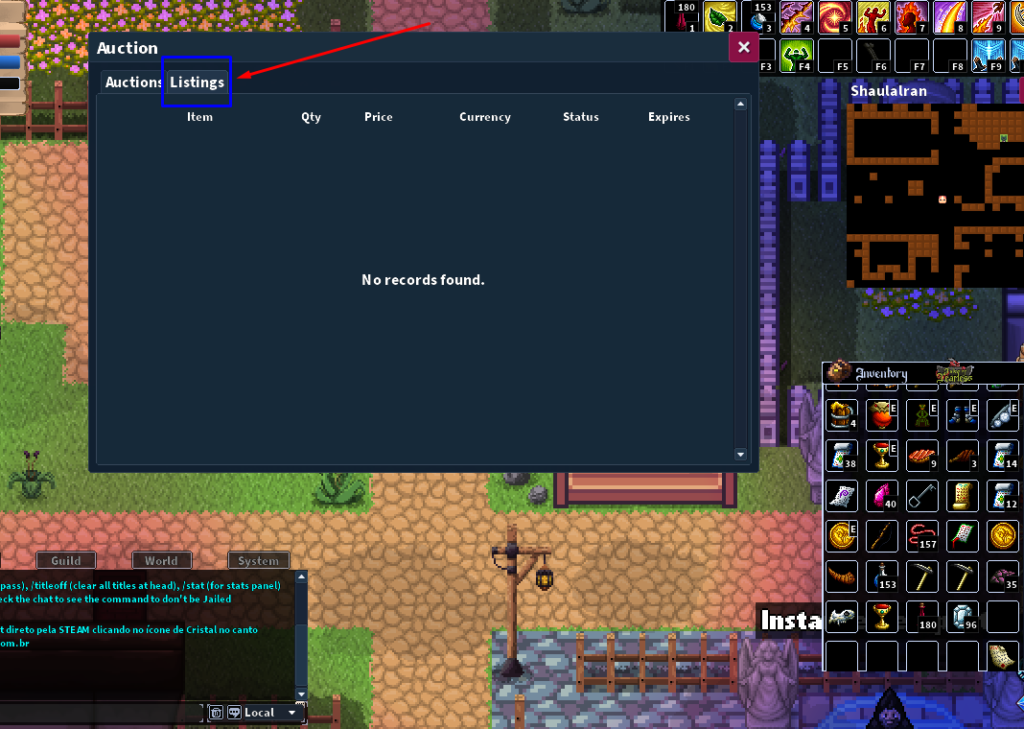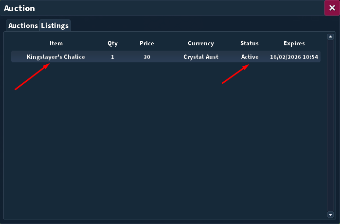 - Acesse a aba Listings dentro da janela de Auction.