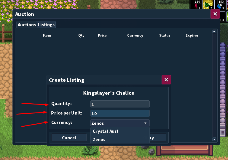 - Defina a quantidade (se o item for acumulável), o preço e a moeda desejada (Aust Crystals ou Zenos).